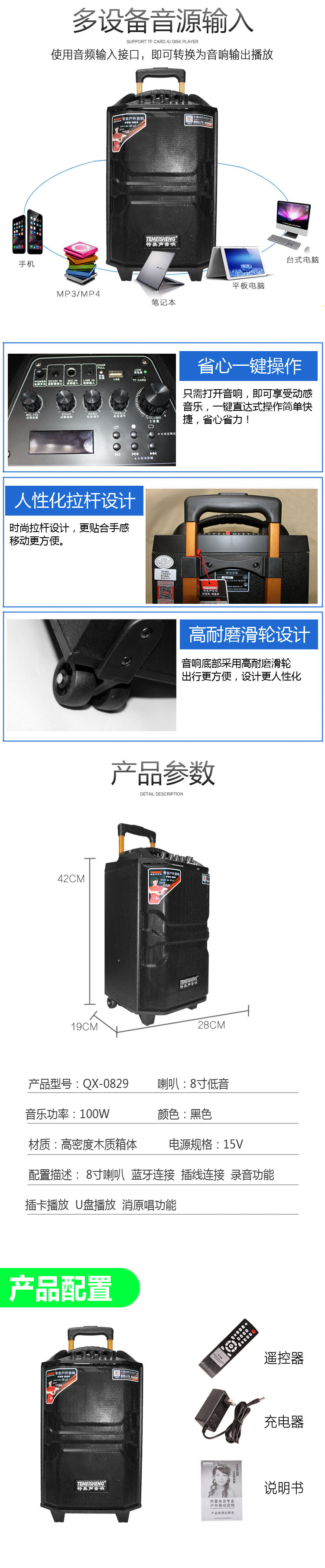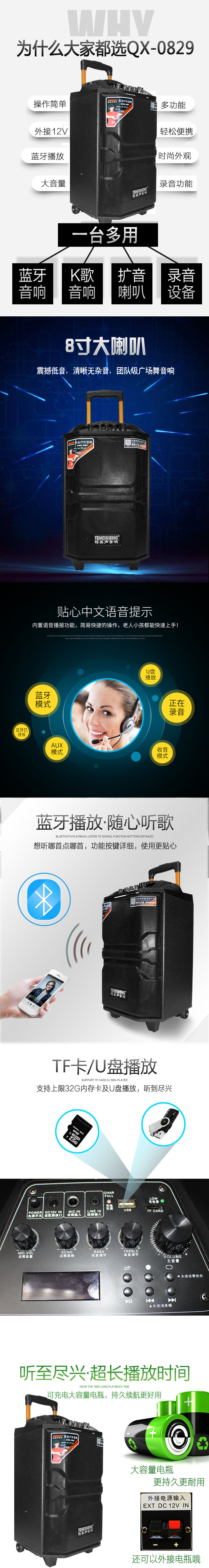 特美声QX-0829 8寸户外移动拉杆广场舞蓝牙大功率话筒重低音